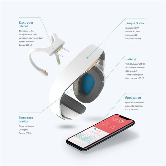 Les retours de l’électro-encéphalogramme sont transformés en ondes sonores pour vous apprendre à écouter votre stress. Et à en prendre le contrôle pour réduire votre sensation de stress, améliorer votre concentration et avoir un sommeil de meilleur qualité.